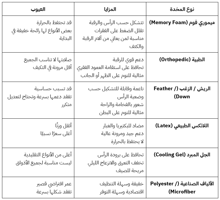 فبين المخدات الطبية، والميموري فوم، والريش، واللاتكس، تختلف الخامات والخصائص، ولكل منها مزايا وعيوب تجعلها الخيار المثالي لشخص، وغير المناسب لآخر.
